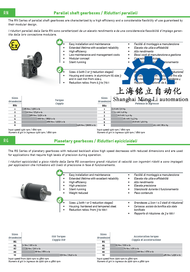 VR/VS系列:功率由0、09KW至1、5KW,扭力由0、5至2500Nm,RC系列的減速比為1/1、5至1/3620,功率0、09KW至22KW,扭力20至2500Nm,RS/RT系列有設計單蝸輪和雙蝸輪,蝸輪加斜齒輪減速三種,功率0.09KW至25KW,減速比1/7至1/10000,扭力3.5Nm至1680Nm。